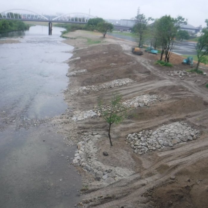 近自然工法 地球環境や自然生態系に配慮した社会を目指して。 一級河川矢作川のワンド(湾処)を守る工事を行いました。 人も水辺まで近づけるようになり、市民の皆様の憩いの場として親しまれるようになりました。 コンクリートや二次製品を使わず、低水路護岸の整備をしました。 自然の中には直線や平行等の間隔はほとんどありません。